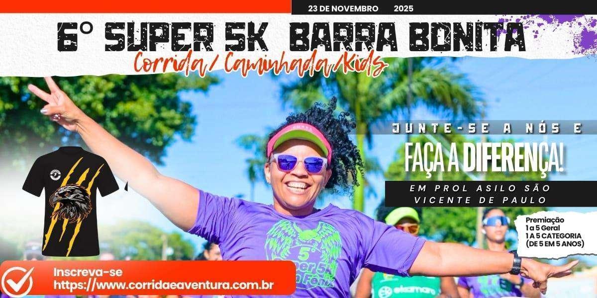 1º O 6° Super5k Barra Bonita , É um Evento Turístico que se destaca pelo percurso 70% Plano ideal para RP ( recorde pessoal) e para iniciantes na corrida , Largada prevista para as 7:30 em Barra Bonita SP !