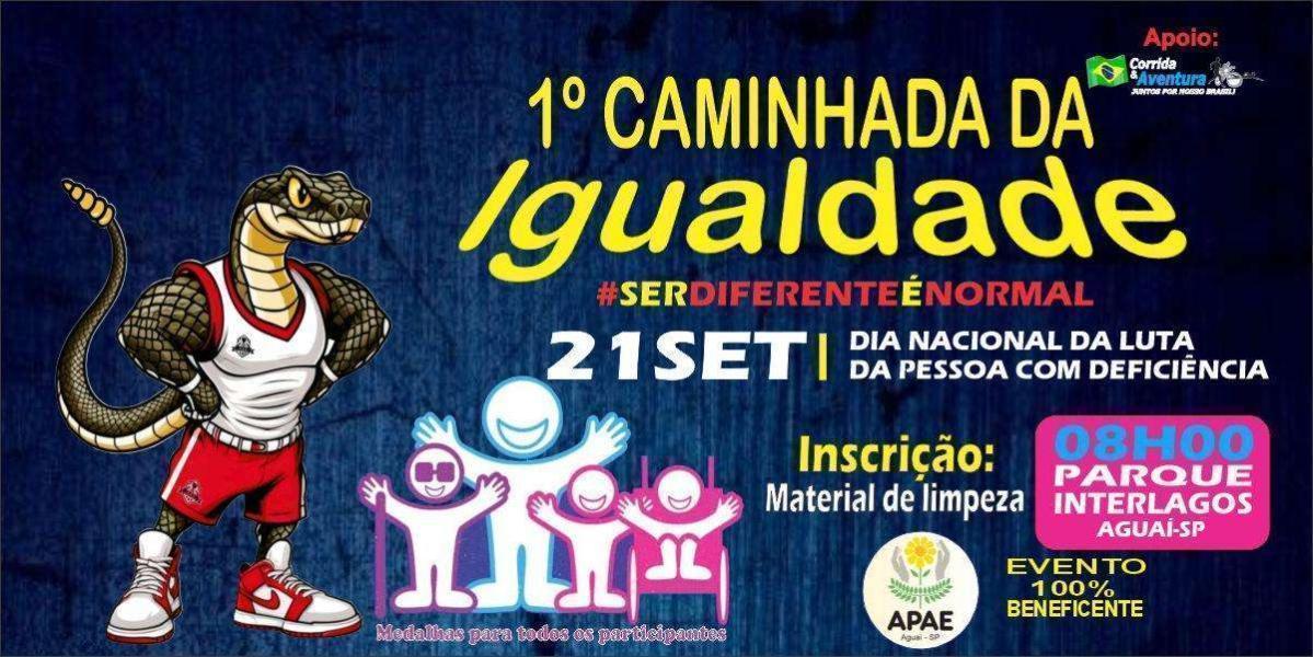 1ª Caminhada da Igualdade – 21 de setembro (Dia Nacional da luta da Pessoa com Deficiência) às 08h, o Parque Interlagos (Aguaí-SP) vira palco de uma manhã de respeito, acolhimento e movimento. Venha caminhar com a gente para celebrar a diversidade e reforçar que #SerDiferenteÉNormal.