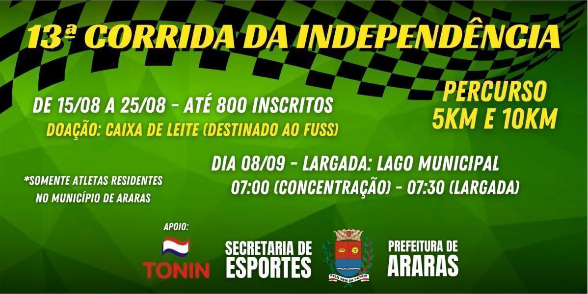 A 13º Corrida da Independência é uma promoção da Prefeitura Municipal de Araras e da Secretaria Municipal de Esportes, onde darão pleno cumprimento ao Regulamento da prova e responderá por todos os detalhes da realização do evento.