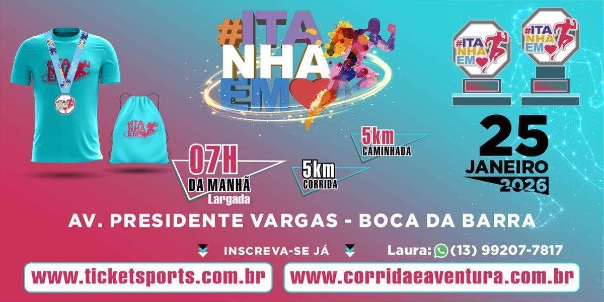 Percurso: corrida 5 km e caminhada 5 km, largada e chegada na Boca da Barra (Monumento #ITANHAÉM), percorrendo a Av. Presidente Vargas, Rua João A. Ferreira e Av. Condessa de Vimieiros até o cruzamento com a R: Joaquim Meira retornando pelo mesmo trajeto.